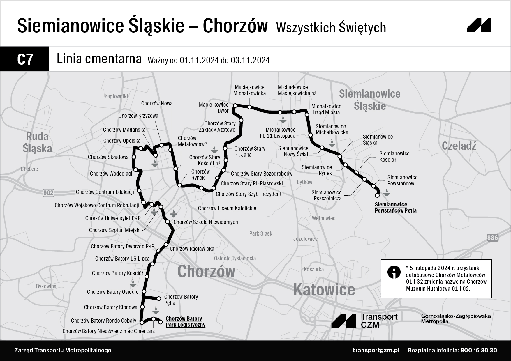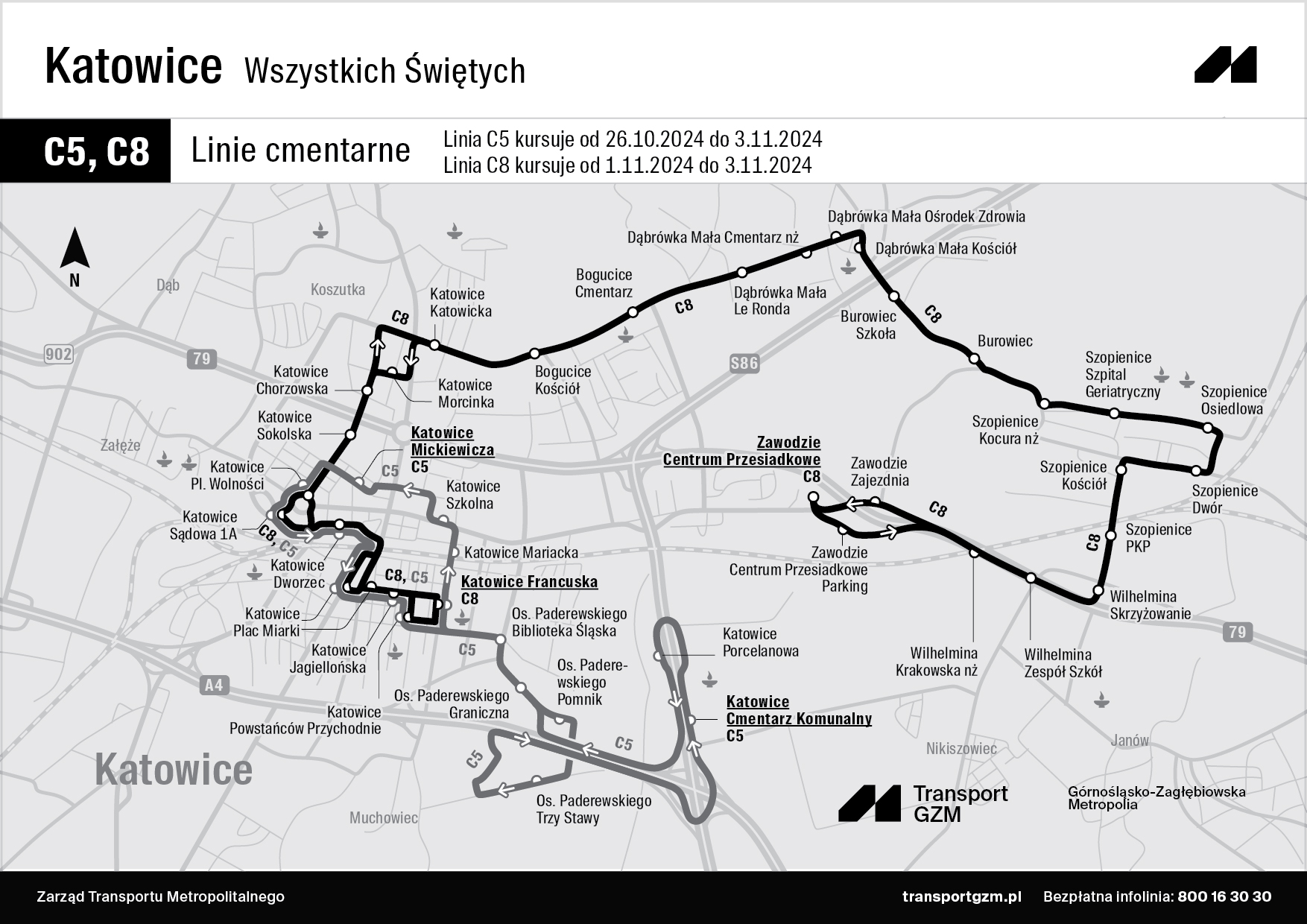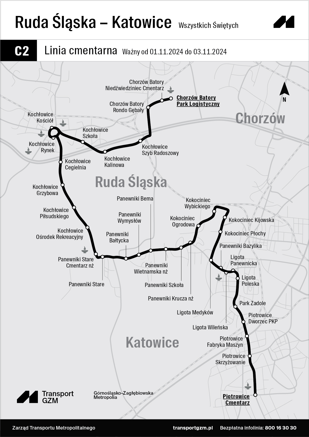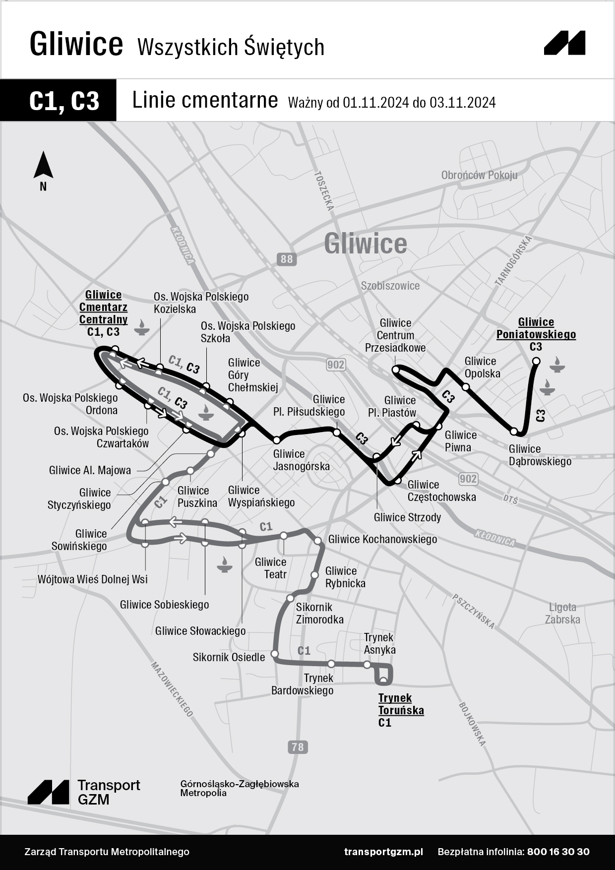 Największe zmiany zaplanowaliśmy na 1 i 2 listopada, czyli w dni Wszystkich Świętych i Zaduszki. Uruchomimy 19 specjalnych linii, które pomogą w dojeździe do cmentarzy. Linie te to: C1 i C3 w Gliwicach, C2 w Chorzowie, Rudzie Śląskiej i Katowicach, C5 i C8 w Katowicach, C6 w Sosnowcu i Będzinie, C7 w Chorzowie i Siemianowicach Śląskich, C9 w Rudzie Śląskiej i Chorzowie, C10 w Knurowie, C11 w Czeladzi, C12–C19 w Tychach oraz C20 w Dąbrowie Górniczej. Dodatkowo, 1 listopada wszystkie przejazdy autobusami, tramwajami i trolejbusami będą bezpłatne.