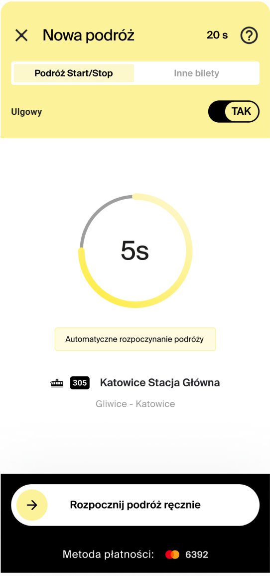 1. Każda podróż w systemie Start/Stop trzeba rozpocząć i zakończyć. Podróżowanie w tym systemie różni się w zależności od tego, czy korzystasz z aplikacji, czy z karty. Jeżeli korzystasz z aplikacji, rozpocznij podróż, skanując kod QR i wybierając opcję Podróż Start/Stop. Zakończ przejazd, wybierając „Podróż” z dolnej belki aplikacji i przesuwając suwak ze strzałką w lewo. W przypadku Metrokarty wystarczy ją przyłożyć do czytnika zaraz po wejściu oraz bezpośrednio przed opuszczeniem pojazdu. Pamiętaj, że z funkcji Podróż Start/Stop możesz korzystać nawet bez posiadania konta w systemie Transport GZM. Jeżeli pojazd, którym się poruszasz, jest wyposażony w mobilny biletomat, wystarczy, że zbliżysz do niego swoją kartę płatniczą bez wybierania żadnej opcji na ekranie. W ten sposób automatycznie rozpoczniesz i zakończysz podróż w systemie Start/Stop.