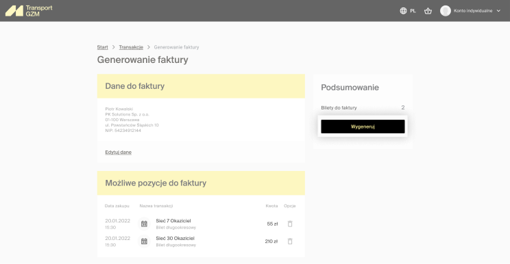 Z listy transakcji (zakupionych biletów) zaznacz te pozycje, dla których chcesz otrzymać fakturę, kliknij „Wygeneruj fakturę”.