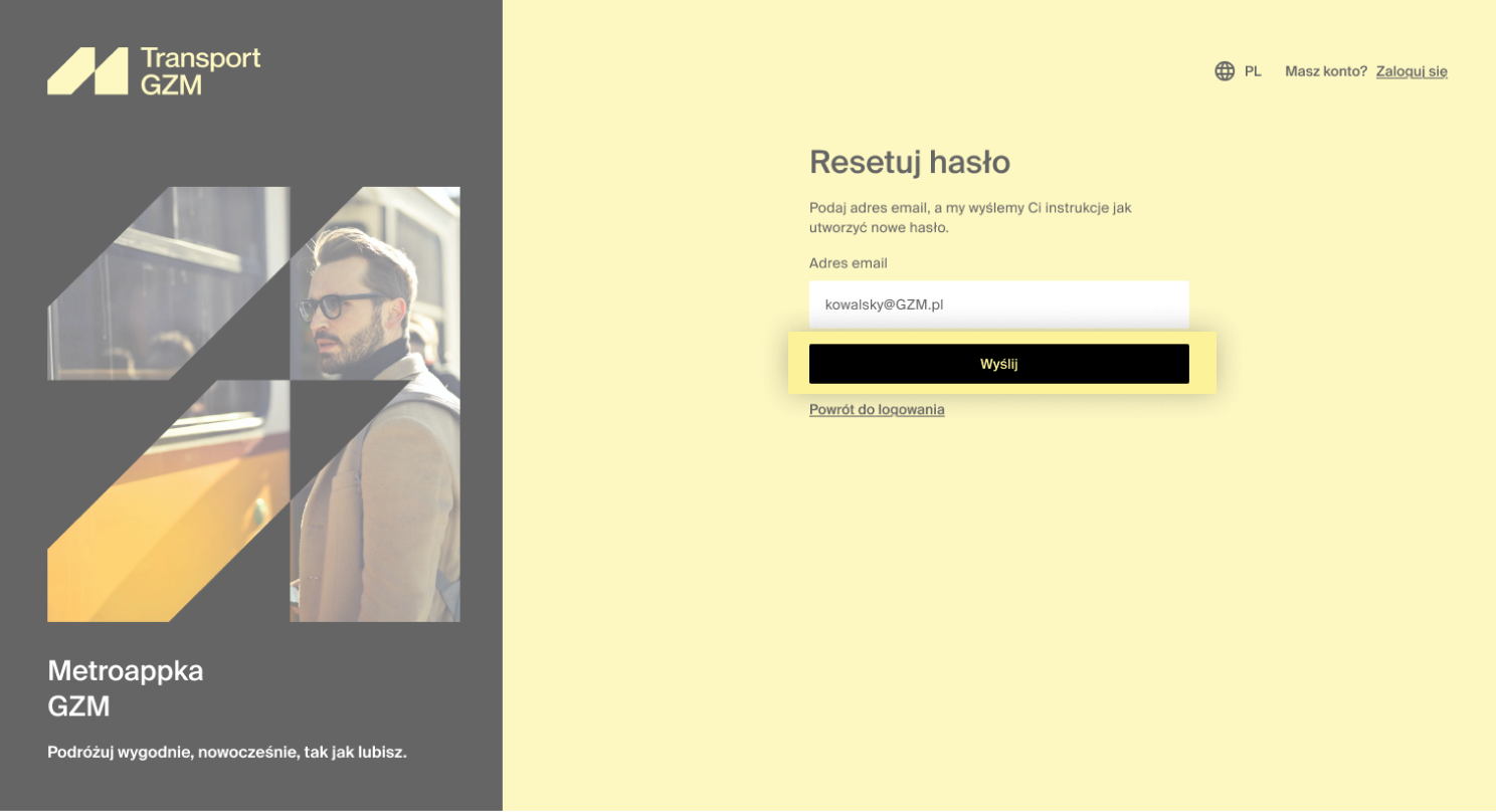 Wpisz w formularzu adres e-mail wykorzystany do utworzenia konta. Kliknij „Wyślij”.