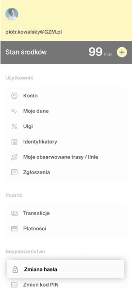 Zaloguj się do Twojego konta za pomocą aplikacji mobilnej, wybierz „Twoje Konto” (piktogram sylwetki człowieka). Następnie wybierz opcję „zmiana hasła”.