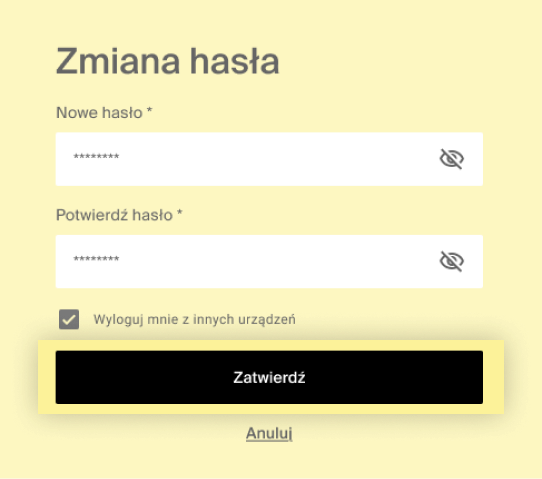 Następnie na ekranie nadaj nowe hasło do Twojego konta i wybierz „Zatwierdź”.