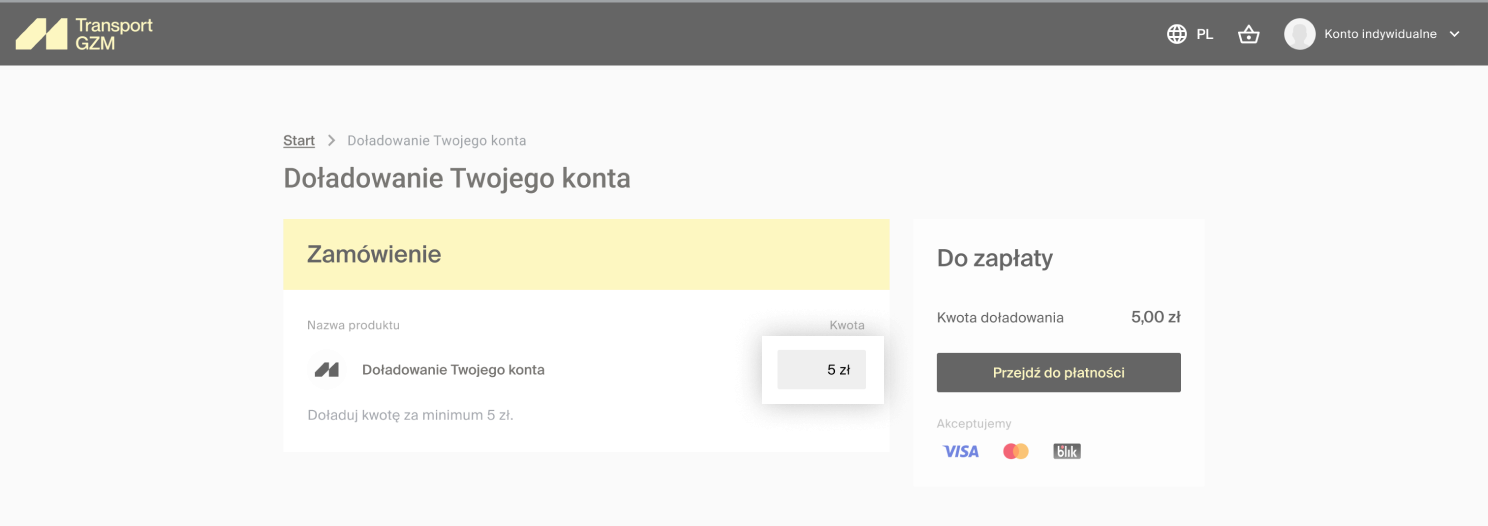 Na ekranie Zamówienie wpisz kwotę, którą chcesz zasilić Twoje konto i zapłać wybraną metodą płatności.